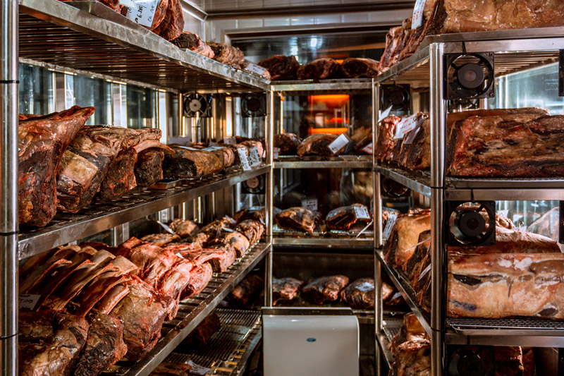 The procedure for dry-ageing beef is quite complex and time-consuming. The beef is stored in a purpose-built temperature-controlled room that also maintains the right level of humidity and constantly controlled air movement so the natural enzymes break down the internal meat fibres to increase the tenderness and flavour of the meat. Then, when the beef is aged sufficiently, according to the chef’s needs, it’s trimmed of the majority of its fat - around 25 to 30% of the meat - the reason why dry-aged beef has a higher cost than non-aged beef.
